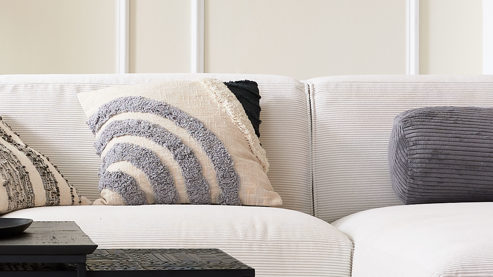 • Die Abbildung zeigt ein Wohnbeispiel, welches auch Dekoration sowie separat erhältliches Zubehör enthält. Im Lieferumfang enthalten ist eine Kissenhülle.