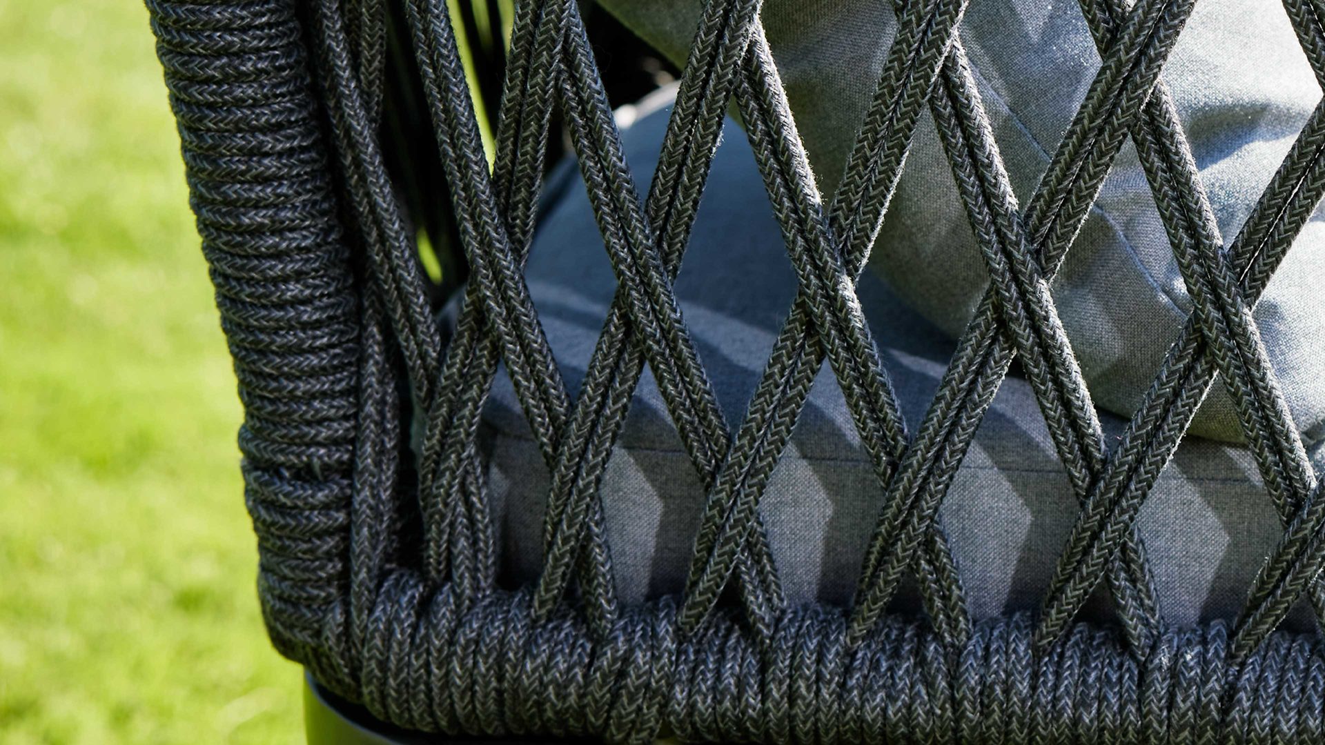 Das Kordelmaterial besteht zu 100 % aus pflegeleichtem Polyester – witterungsbeständig, strapazierfähig und formstabil. Die weichen Sitz- und Rückenkissen mit PU-Schaumfüllung sorgen für entspannten Komfort. Die dunkelgrauen Bezüge kannst du einfach abnehmen und bei 30 Grad waschen.