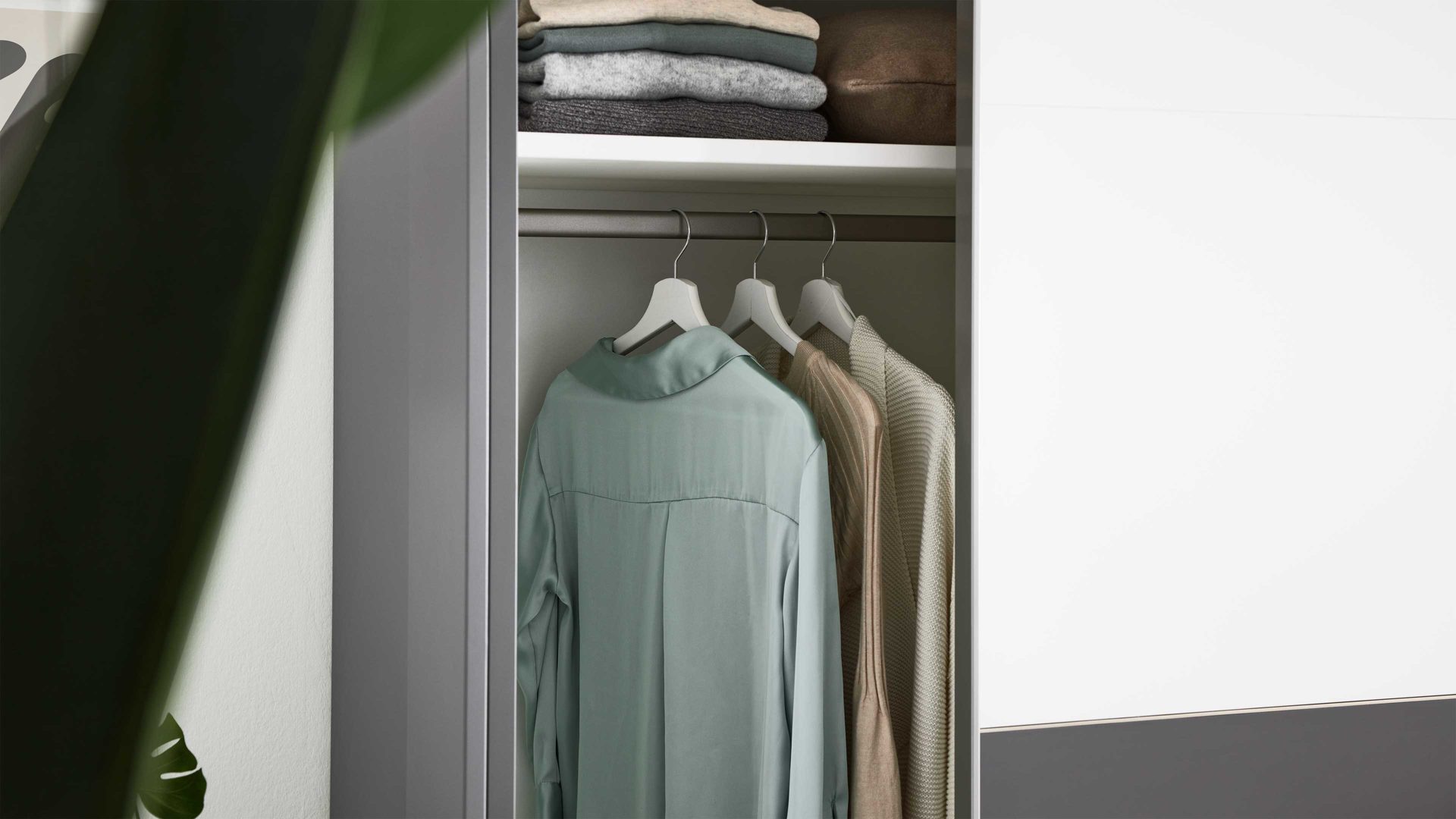 Schwebetürenschrank aus der Interliving Kleiderschrank Serie 1207 – moderner Auftritt in Weiß und Manhattangrau