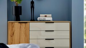 Mit Maßen von ca. 120 x 86 x 43 cm (B/LxHxT) bietet dir die Stauraumkommode großzügigen Platz für Kleidung, Wäsche oder Accessoires. Sie schafft Ordnung und Übersichtlichkeit – perfekt für alle, die ihr Schlafzimmer stilvoll und funktional gestalten möchten. Die linke Seite verfügt über eine Tür mit furnierter Front. Dahinter befindet sich ein Einlegeboden, ideal für größere oder empfindliche Kleidungsstücke. Rechts stehen dir fünf Auszüge mit champagnerfarbenen Glasfronten zur Verfügung. Dank Vollauszug und Softclose-Technik schließen die Schubladen angenehm leise und sanft – Komfort, den du jeden Tag spürst.