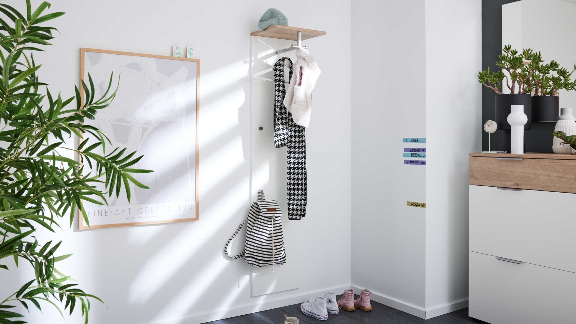 • Die Abbildung zeigt ein Wohnbeispiel, welches auch Dekoration sowie separat erhältliches Zubehör enthält. Im Lieferumfang enthalten ist eine Wandgarderobe.