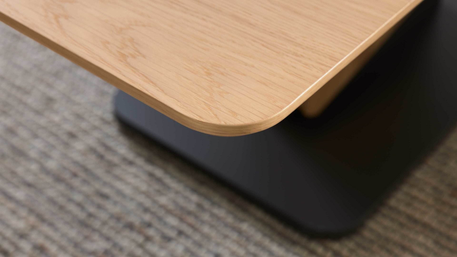Die Kombination aus natürlichem Wildeichefurnier, dunklen Akzenten und robusten Metallelementen in Anthrazit-Metallic sorgt für eine harmonische Balance zwischen Wohnlichkeit und modernem Design. Die feine Maserung der Tischplatte verleiht dem Tisch Tiefe und Wärme, während die klaren Linien und das formstabile Untergestell ein Gefühl von Leichtigkeit vermitteln.