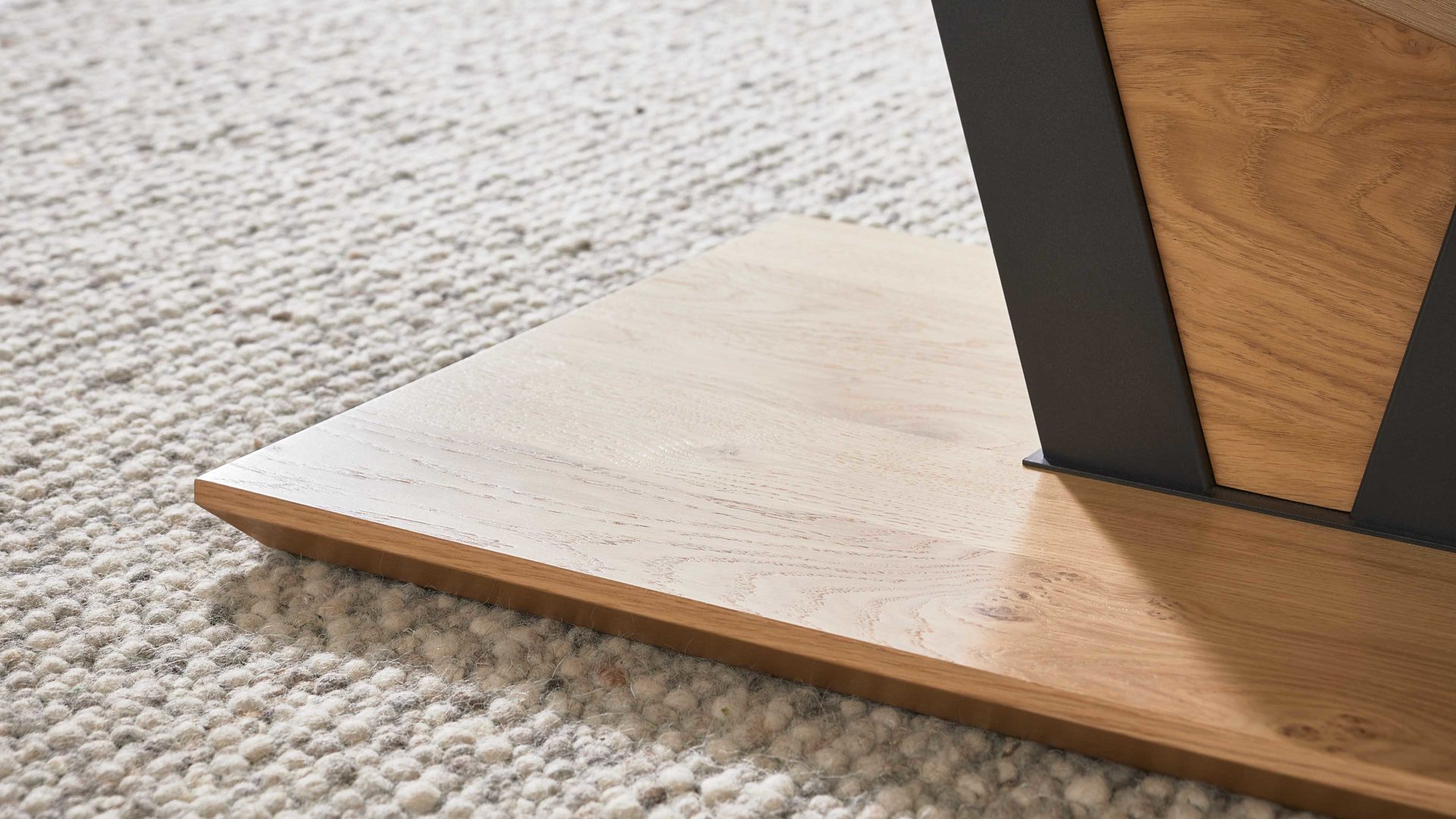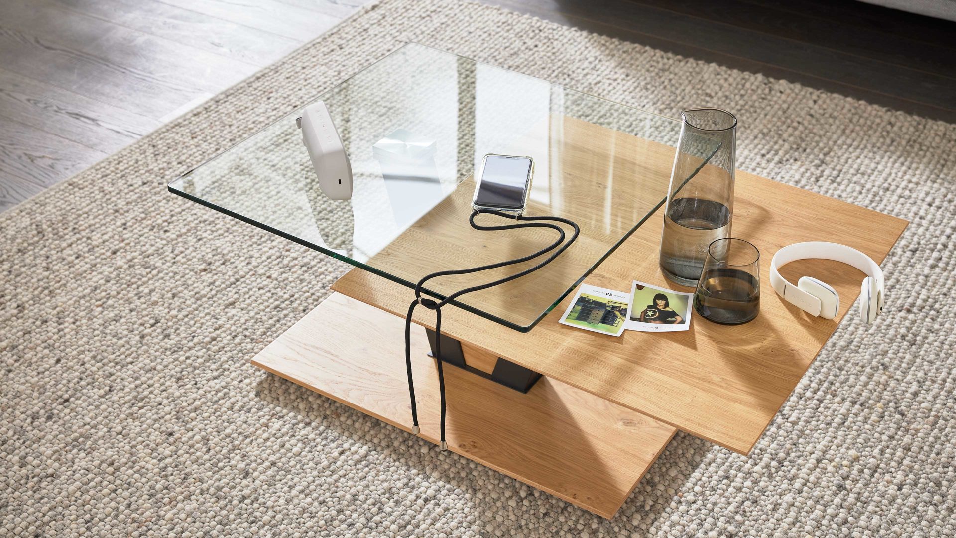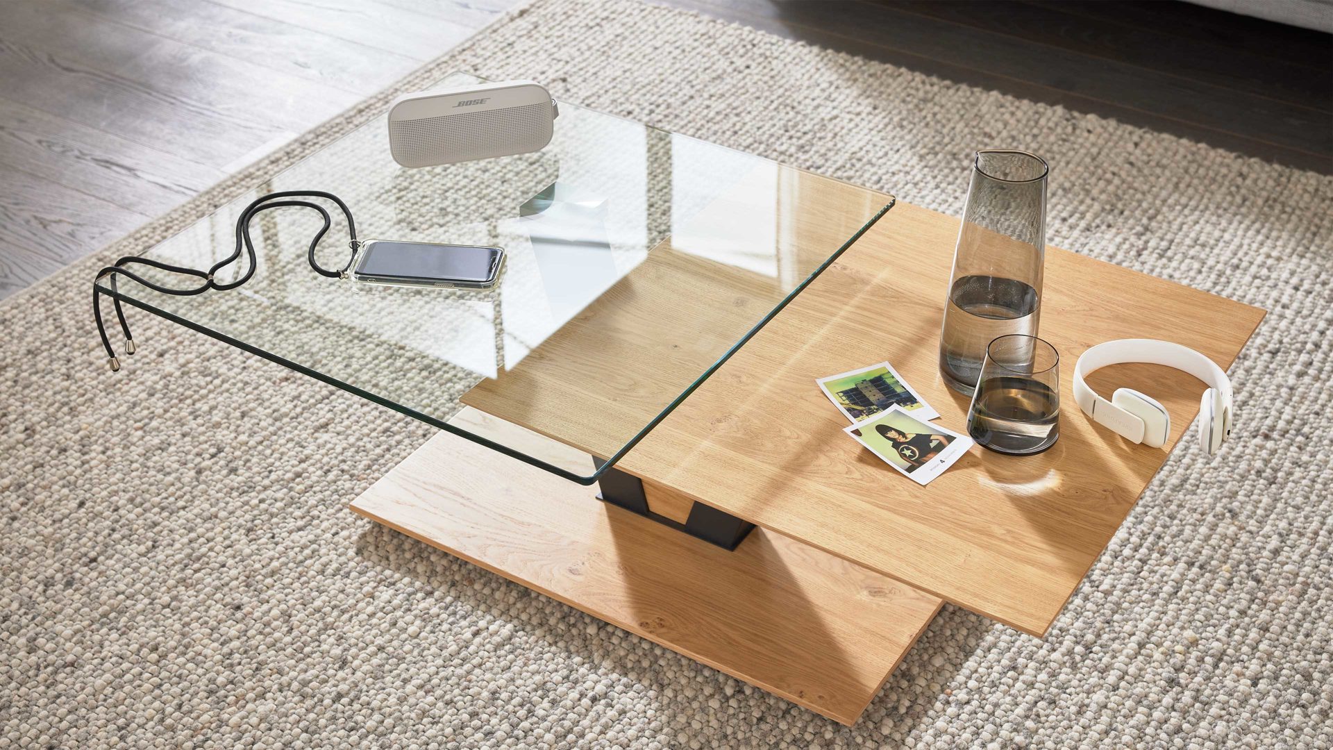 Ein besonderes Highlight sind die zwei versetzten Tischplatten aus Glas und Furnier, die dem Tisch eine elegante Leichtigkeit und architektonische Raffinesse verleihen. Die ca. 10 mm starke Glasplatte ist um 360 Grad drehbar – so kannst du sie flexibel ausrichten und die Ablagefläche jederzeit an deine Bedürfnisse anpassen.