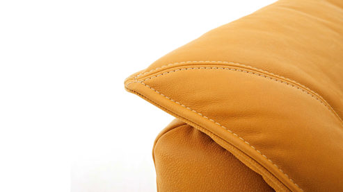 sonnengelber Lederbezug mit einer beigen Kontrastnaht und mattschwarzen Metallkufen