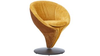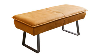 sonnengelber Lederbezug mit einer beigen Kontrastnaht und mattschwarzen Metallfüßen