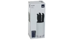 Praktisch und stilvoll zugleich: der Messerblock Acida von kela. Dieser beinhaltet fünf verschiedene qualitativ hochwertige Messer, von klein bis groß, die aus Edelstahl gefertigt sind. Der Messerblock ist aus weißem PP-Kunststoff gefertigt. Dieser hat zudem ein praktisches Innenleben, das einfach herausnehmbar ist. Die Messer sind durch dünne Kunststoff-Streifen im Messerblock voneinander getrennt und können somit nicht so leicht verkratzen. Maße ca. 11 x 23 cm (DxH) mit 1 x Chefmesser ca. 32 cm (L), 1 x Fleischmesser ca. 32 cm (L), 1 x Brotmesser ca. 32 cm (L), 1 x Ausbeinmesser ca. 24 cm (L), 1 x Küchenmesser ca. 20 cm (L)