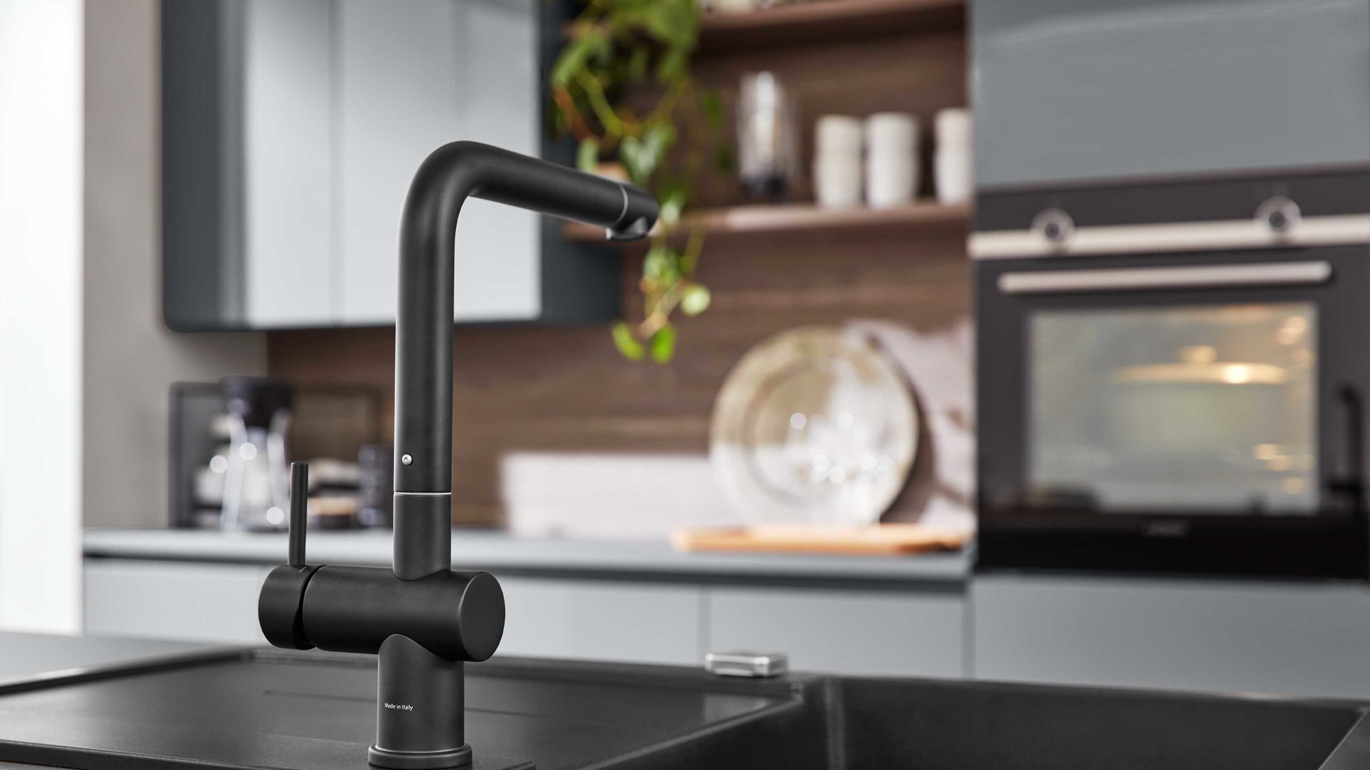 Die Küche überzeugt nicht nur optisch, sondern auch praktisch. Sie besteht aus einer ca. 300 cm langen Küchenzeile und einer ca. 240 cm langen Kücheninsel, die mit einer edel-mattschwarzen Interliving Einbauspüle sowie einer hochwertigen schwarzen Einhebel-Mischbatterie ausgestattet ist. Viele Schränke, Auszüge und offene Elemente schaffen ausreichend Platz für Geschirr, Lebensmittel und Küchenzubehör.