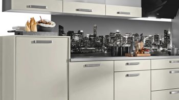matt hellgraue Lacklaminatfronten, kombiniert mit matten hellgrauen Glasfronten und edelstahlfarbenen Bügelgriffen