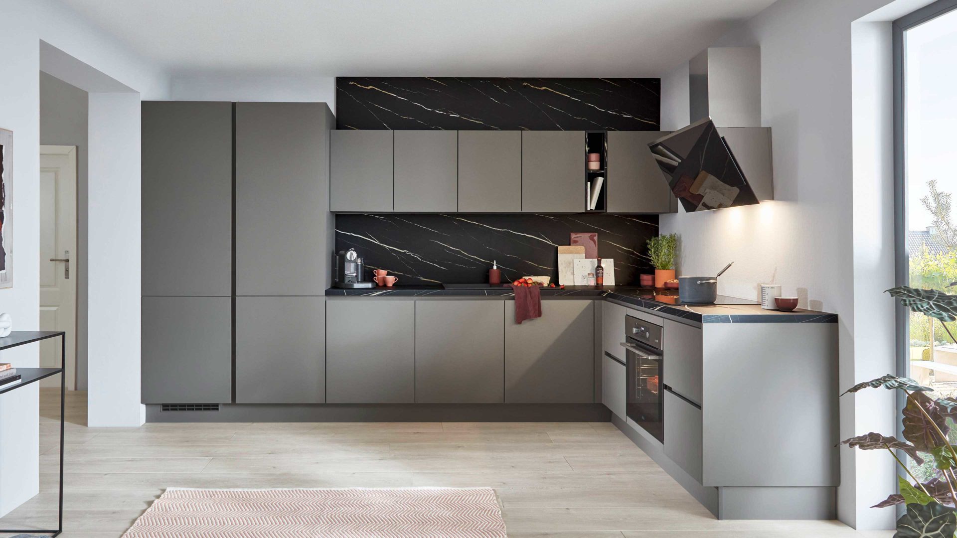 mattes Anthrazit, kombiniert mit astiger Eiche-Nachbildung und schwarzen Metallgriffen