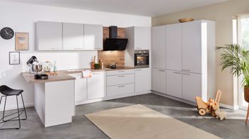 mattes Hellgrau, kombiniert mit brauner Eiche-Nachbildung und edelstahlfarbenen Metallgriffen