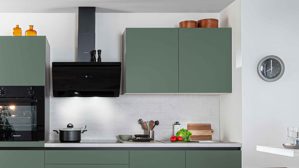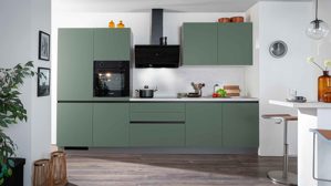 supermatt dunkelgrüne Lacklaminatfronten, kombiniert mit anthrazitfarbenen Korpussen und Sockelblenden
