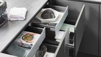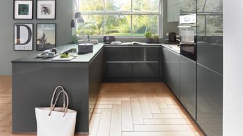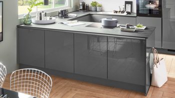 Für das gewisse Etwas sorgen die grifflose Frontgestaltung sowie die extra dünnen Slime-Line Arbeitsplatten, die wiederum in Schiefergrau designt sind.