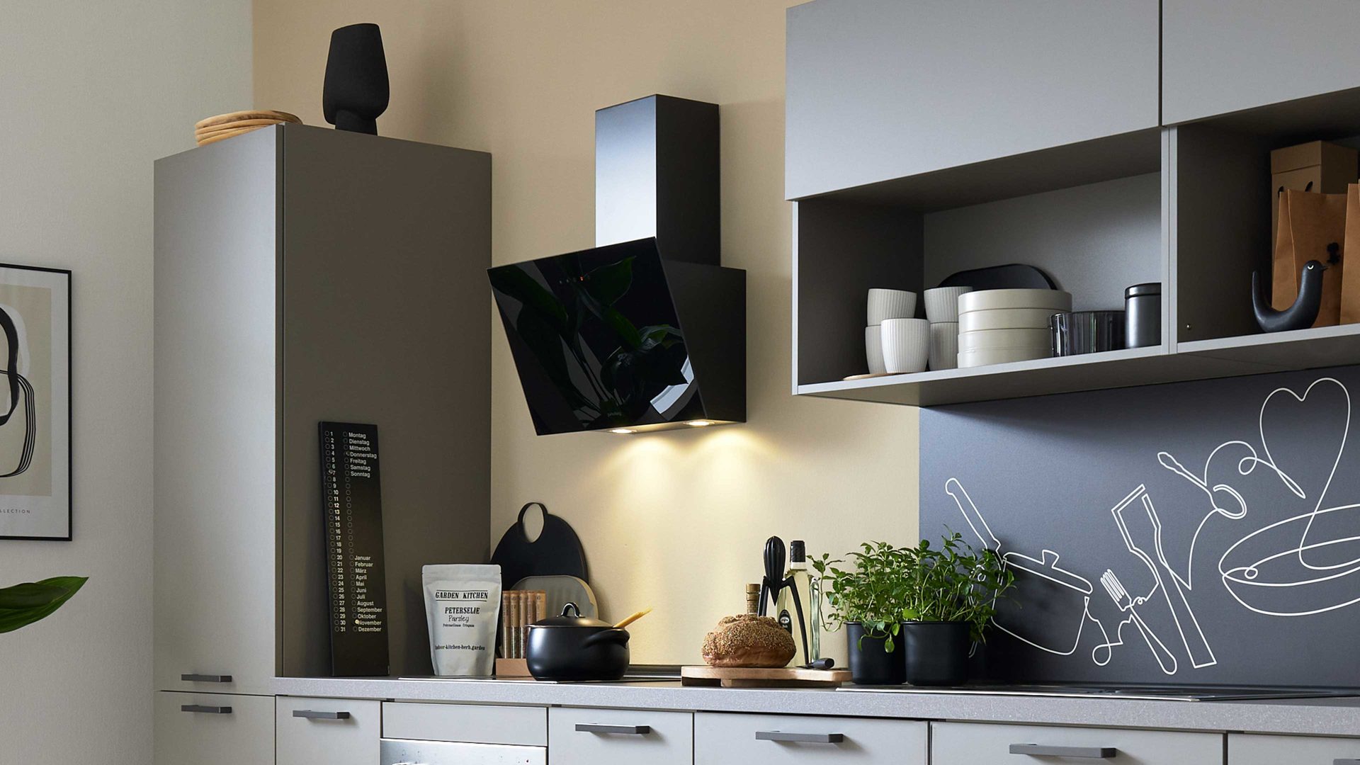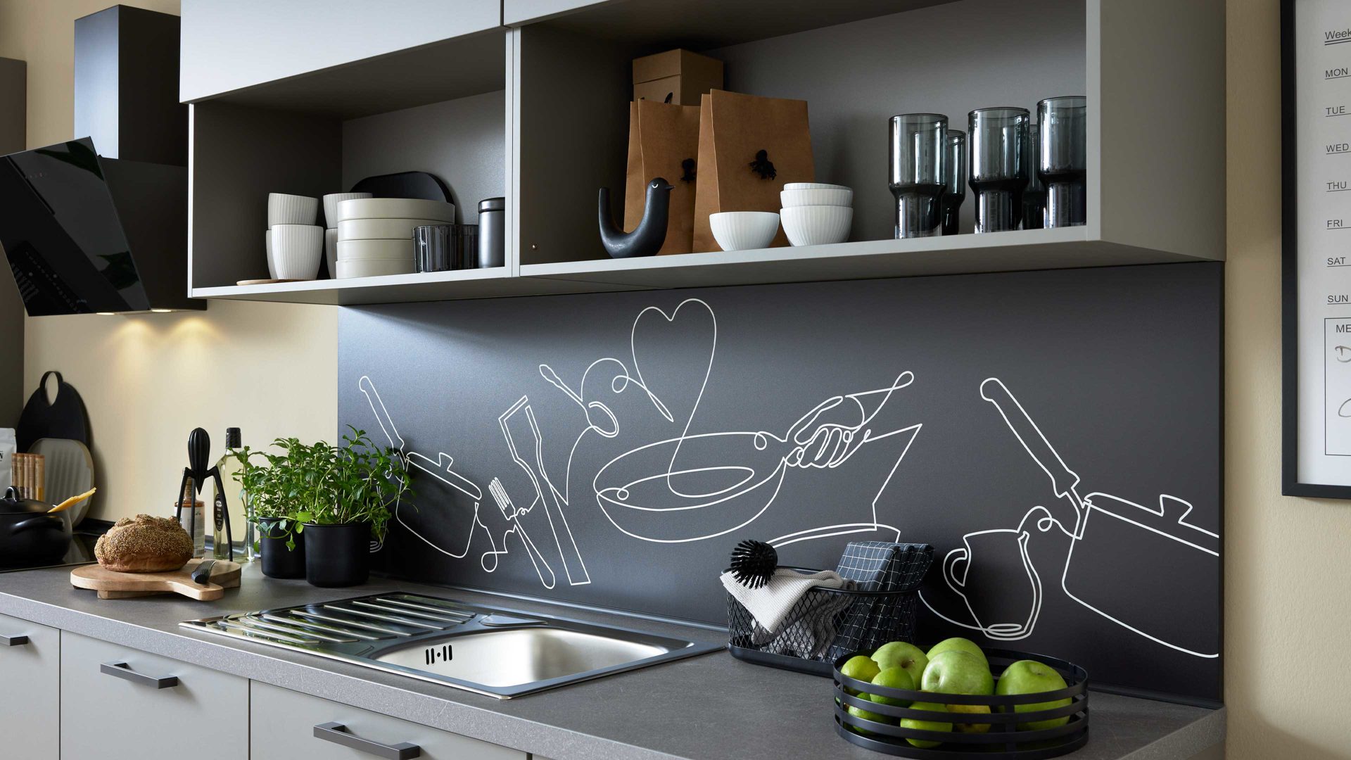 Arbeitsplatten in taupegrauer Basalt-Nachbildung und Nischenverkleidung im Dekor Cooking
