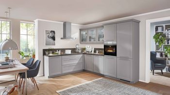 supermattes Kaschmirgrau und Arbeitsplatten in honigfarbener Eiche-Nachbildung