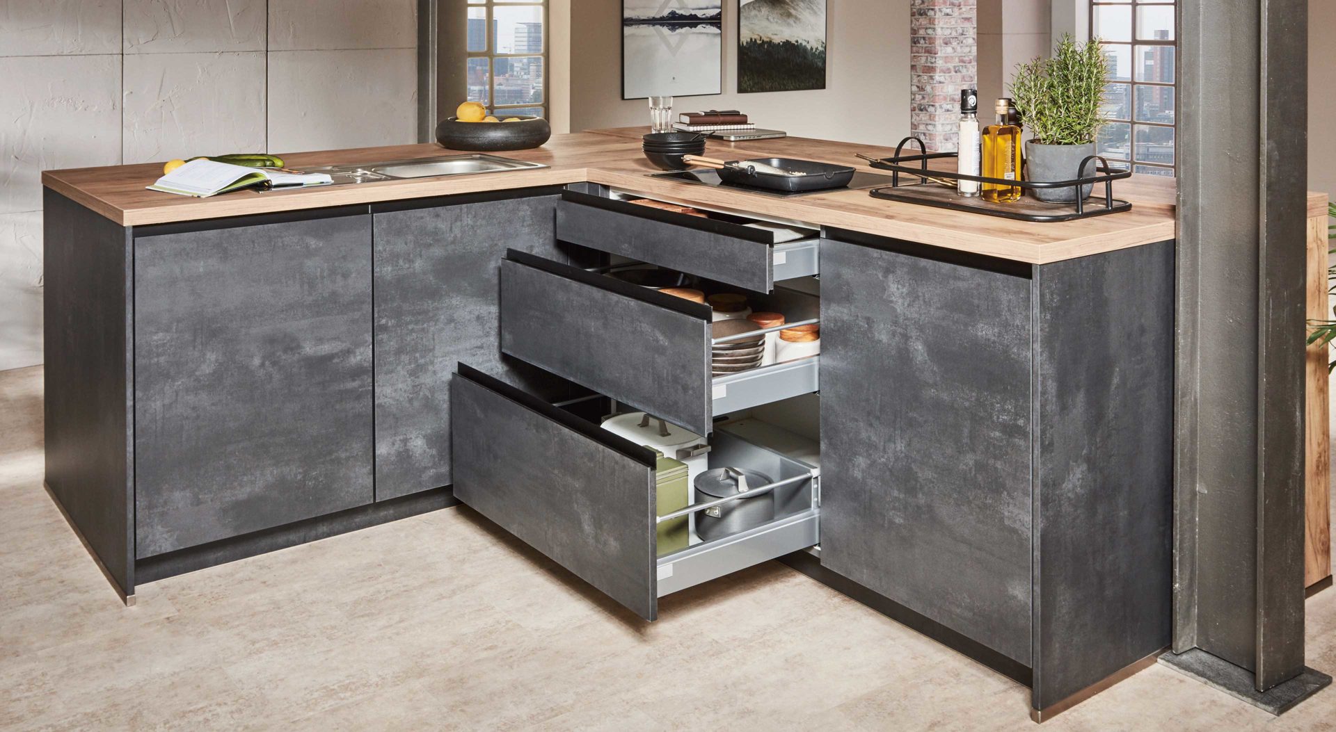 Die nobilia® Einbauküche Laser begeistert mit ihrem wilden Industrie-Look, der exzellenten Verarbeitung und der hohen Funktionalität. Sie kombiniert schwarzbetonfarbene Fronten mit Taxus-Nachbildung. Der Korpus und die Sockelblenden sind ebenfalls im speziellen Schwarzbetonton gestaltet, während die Arbeitsplatten und Sichtseiten die warme Taxusnuance aufgreifen. Akzentuierend wirkt die grifflose Frontgestaltung.