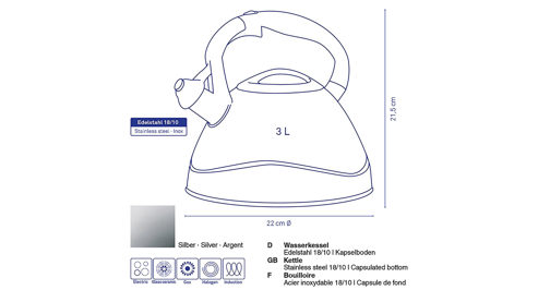 Traditioneller Wasserkessel aus Edelstahl mit Kapselboden, welcher sich für alle Herdarten eignet. Der Griff ist rutschfest und hat den Öffner zum Ausgießen des heißen Wassers praktisch integriert, sodass man nicht mit dem heißen Wasserdampf in Berührung kommt. Durchmesser ca. 22 cm, Fassungsvermögen 3 Liter, Farbvariante: Edelstahl.