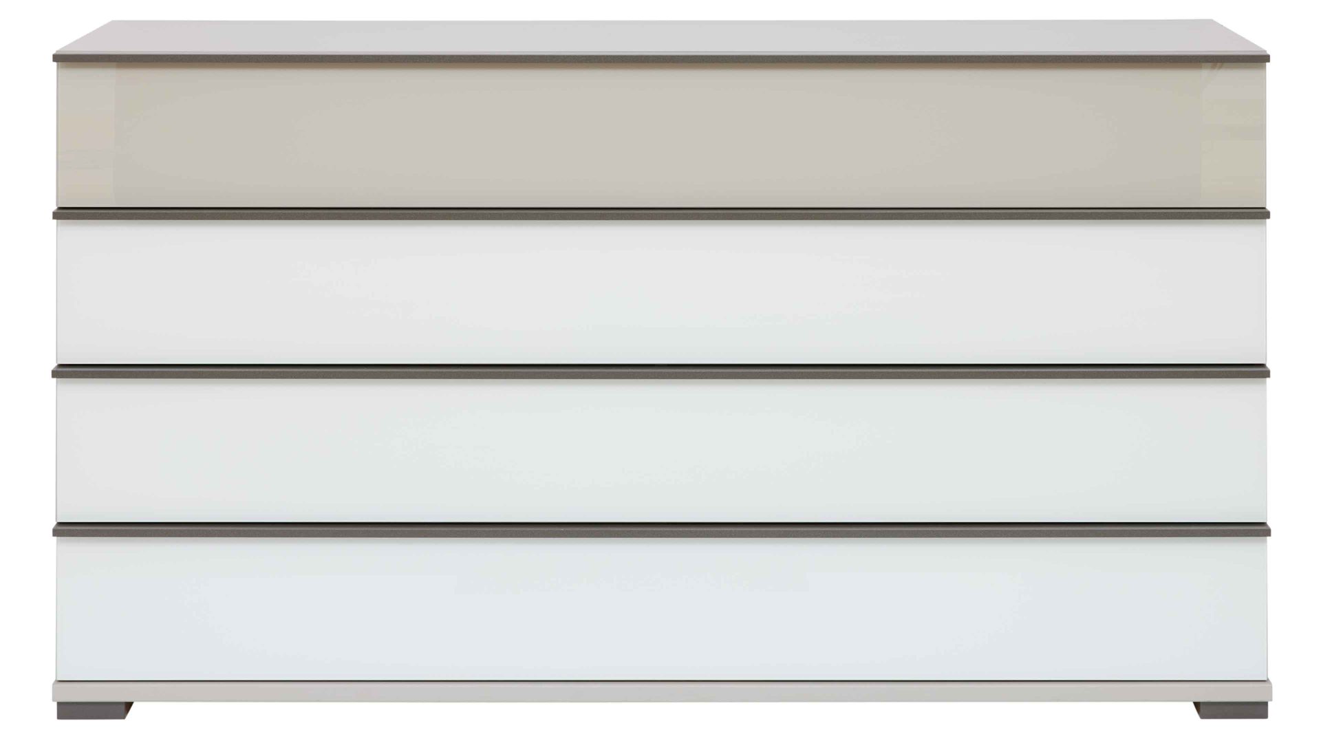 Die Schubladenkommode aus der Interliving Schlafzimmer Serie 1032 vereint modernes Design mit durchdachter Alltagstauglichkeit. Die Kombination aus weißen und kieselgrauen Glasfronten und pflegeleichten weißen Kunststoffoberflächen verleiht der Kommode eine helle, elegante Ausstrahlung. Griffleisten aus schieferfarbenem Metall setzen stilvolle Kontraste, während das silbergrau gestreifte Innendekor den hochwertigen Charakter des Möbels unterstreicht.