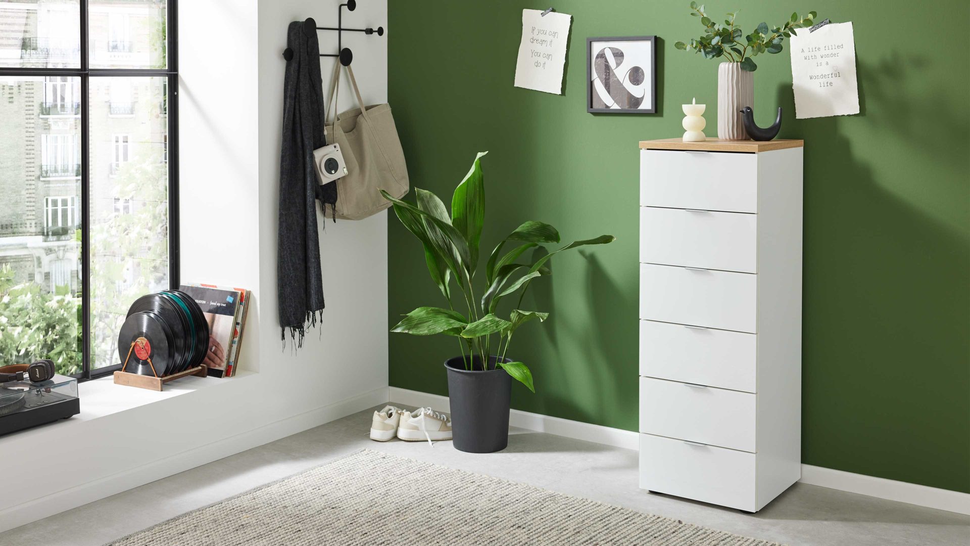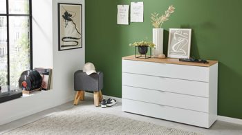 Die Kommode lässt sich hervorragend als Beistellschrank oder Solitärkommode einsetzen und fügt sich dank ihres klaren Designs nahtlos in dein Schlafzimmerkonzept ein – für ein harmonisches und stilvolles Gesamtbild.