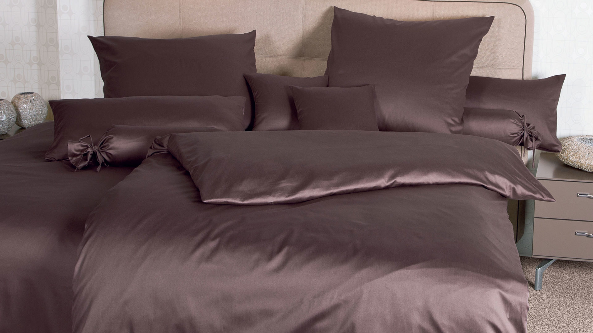 Das Modell Colors 31001 von der Marke Janine® aus geschmeidigem Mako-Satin in schokofarben in der Größe ca. 135 x 200 cm mit Kissenbezug in der Größe ca. 80 x 80 cm. Mako-Satin von Janine ist aus 100% naturreiner Mako-Baumwolle gefertigt. Dank der Mercerisierung, einem speziellen Veredlungsprozess für Baumwolle, erhält der Bettbezug ein samtiges Glanzfinish, das nicht nur das Dessin unterstreicht, sondern auch angenehm leicht und weich auf der Haut anliegt. Dazu ist die Janine-Satinbettwäsche äußerst pflegeleicht. Die Bettwäsche ist bis 60 Grad waschbar und trocknergeeignet. Des Weiteren ist in den Bettbezug ein Reißverschluss eingearbeitet, mit dem Sie die Bettzeuggarnitur einfach mit einem Zip wieder aufziehen können.