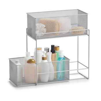 Dank diesem praktischen Etagenregal aus Stahlgeflecht mit zwei Körben aus Mesh gewinnen Sie wertvollen Stauraum in Ihrem Zuhause. Es schafft Ordnung in Ihren Schränken und Regalen und eignet sich ideal für den Einsatz in den Küchen-, Vorrats- oder Badschränken.