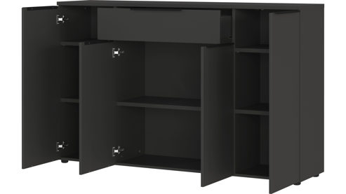 eine Schublade und vier Türen, dahinter fünf verstellbare Einlegeböden