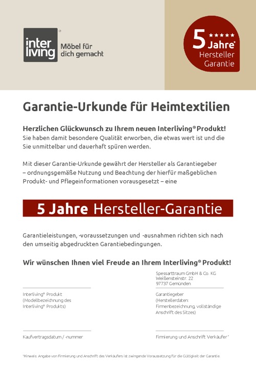 Alle Bettdecken der Interliving Bettdecke Serie 9202 sind in verschiedenen Größen und drei Wärmeklassen erhältlich – von der leichten Sommerdecke bis zur kuscheligen Winterdecke. Ergänzend findest du passende Kopfkissen derselben Serie für ein harmonisches Schlafgefühl. Alle Bettwaren der Interliving Bettdecke Serie 9202 werden klimaschonend in Deutschland hergestellt und kommen mit einer vom Hersteller gewährten 5 Jahre Herstellergarantie.