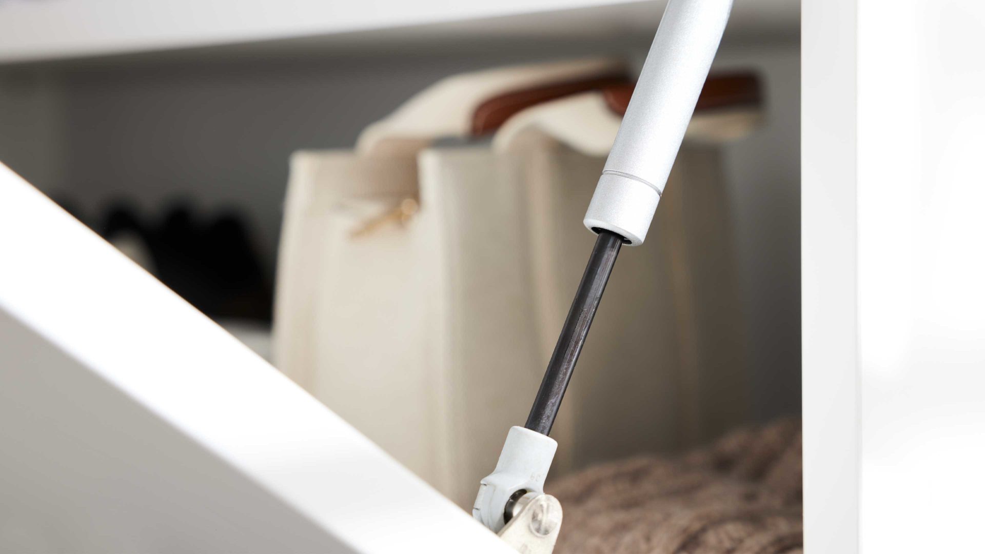 Der Schuhschrank bringt deine Garderobe aufgeräumt und stilvoll unter: Oben sorgt eine geteilte Schublade für Ordnung bei kleineren Dingen wie Schlüssel, Schuhpflege oder Handschuhen. Zwei darunterliegende Klapptüren verbergen jeweils zwei großzügige Fächer – ideal für die strukturierte Aufbewahrung deiner Schuhe. Alles ist schnell griffbereit, ordentlich verstaut und dabei dezent verborgen.