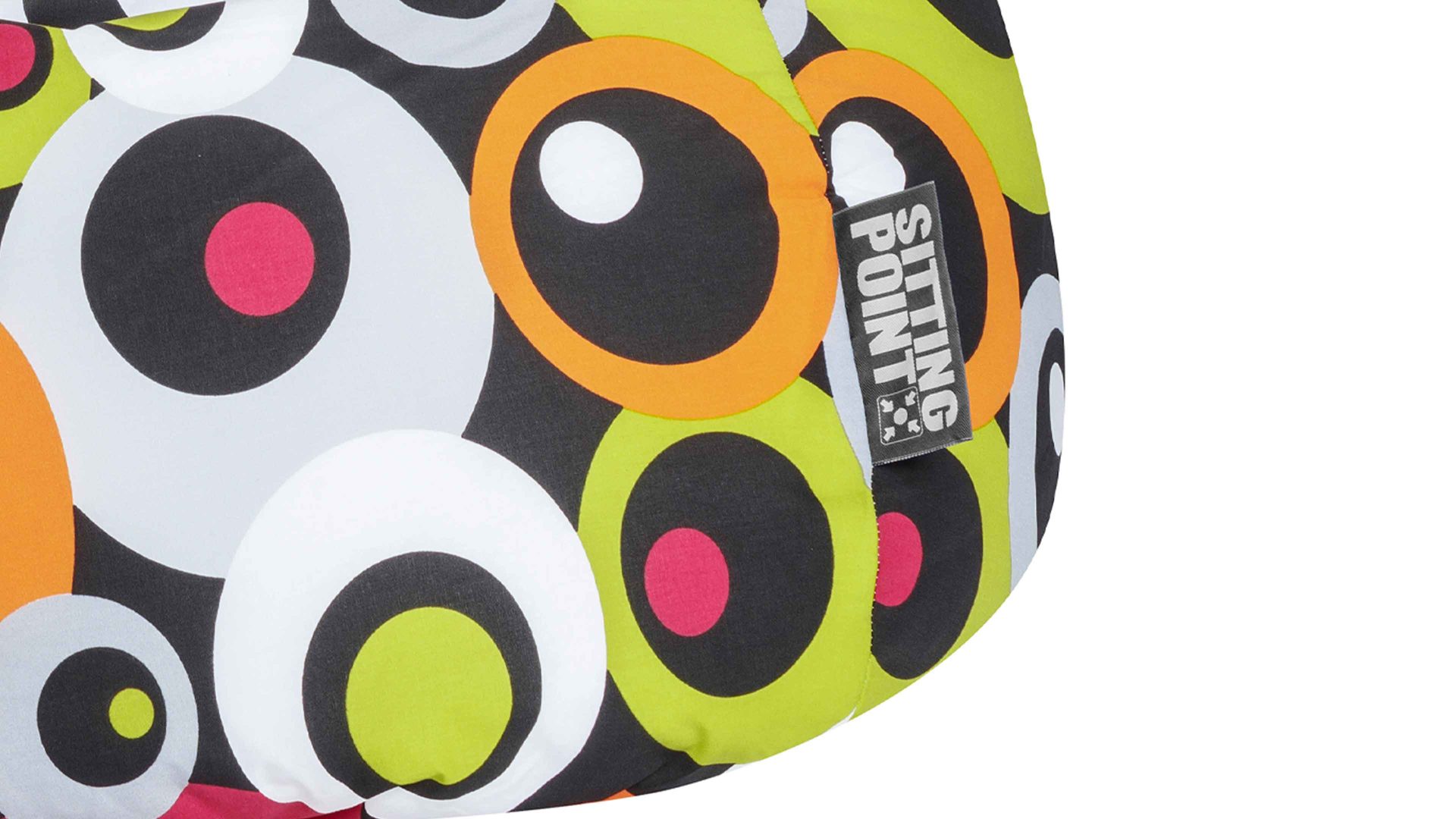 Mit seinen bunten Kreisen und Kringeln ist der Bean Bag L der Marke SITTING POINT nicht zu übersehen. Das moderne Sitzmöbel mit den orangefarbenen, pinken, weißen, grauen und grünen Elementen auf schwarzem Grund ist mit hochwertigen Polystrol-Kügelchen gefüllt und mit einem Überzug aus Baumwolle ausgestattet.
