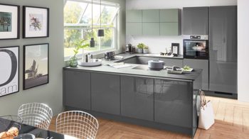 Die verspiegelte Nischenverkleidung lässt den Raum größer und heller wirken, während die großzügigen Arbeitsflächen dir beim Zubereiten und Servieren jede Menge Komfort bieten. Die hochwertige SCHOCK Einbauspüle in Magmafarbe fügt sich harmonisch ins Design ein und setzt einen stilvollen, modernen Akzent.