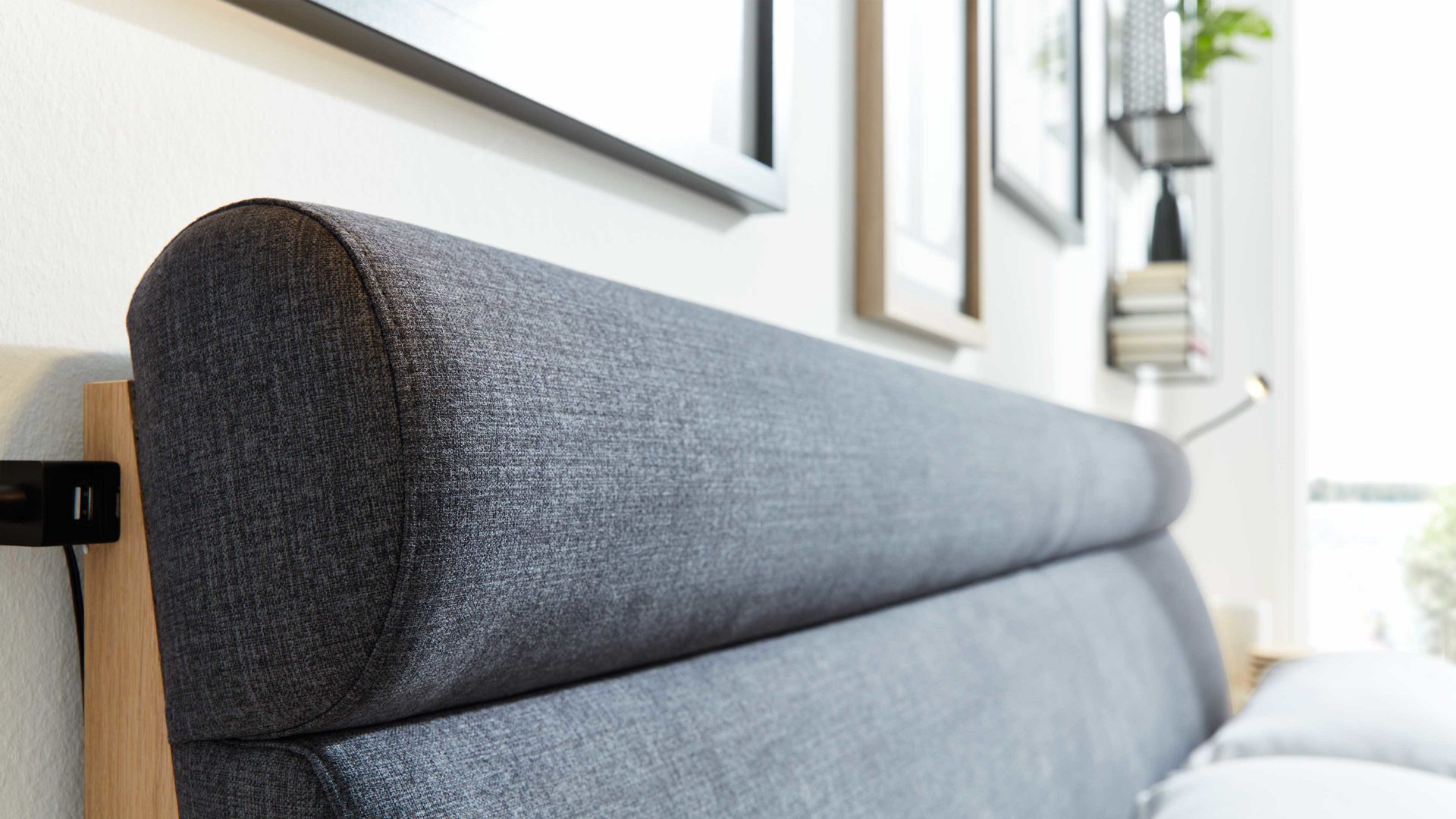 Die anthrazitfarben pulverbeschichteten Bügelgriffe und der gepolsterte Bettkopfteil mit anthrazitfarbenem Stoffbezug unterstreichen den modernen Charakter der Serie und setzen stilvolle Akzente. Die weiß lackierten Innenkorpusse schaffen einen hellen, freundlichen Innenraum und runden das hochwertige Gesamtbild perfekt ab.