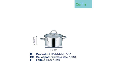 In ausgezeichneter Qualität: der Bratentopf Cailin aus 18/10 Edelstahl in Glanzoptik, mit Kapselboden und 0,6 mm Wandstärke. Inklusive Glasdeckel mit Edelstahlgriff. Geeignet für Gas, Glas-Keramik, E-Herd und Induktionsherd. Backofenfest bis 180° C. Maße ca. 16 x 8 cm (DxH), Volumen 1,25 l. Spülmaschinenfest.