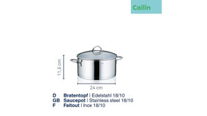 In ausgezeichneter Qualität: der Bratentopf Cailin aus 18/10 Edelstahl in Glanzoptik, mit Kapselboden und 0,8 mm Wandstärke. Inklusive Glasdeckel mit Edelstahlgriff. Geeignet für Gas, Glas-Keramik-Kochfeld, E-Herd und Induktionsherd. Backofenfest bis 180° C. Maße ca. 24 x 12 cm (DxH), Volumen 4,75 l. Spülmaschinenfest. Lieferung im Geschenkkarton.