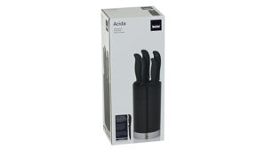 Praktisch und stilvoll zugleich: der Messerblock Acida von kela. Dieser beinhaltet fünf verschiedene qualitativ hochwertige Messer, von klein bis groß, die aus Edelstahl gefertigt sind. Der Messerblock ist aus schwarzem PP-Kunststoff gefertigt. Dieser hat zudem ein praktisches Innenleben, das einfach herausnehmbar ist. Die Messer sind durch dünne Kunststoff-Streifen im Messerblock voneinander getrennt und können somit nicht so leicht verkratzen. Maße ca. 11 x 23 cm (DxH) mit 1 x Chefmesser ca. 32 cm (L), 1 x Fleischmesser ca. 32 cm (L), 1 x Brotmesser ca. 32 cm (L), 1 x Ausbeinmesser ca. 24 cm (L), 1 x Küchenmesser ca. 20 cm (L)