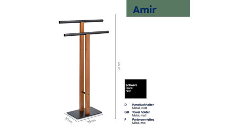 Handtuchhalter aus schwarzem Metall und eingefärbtem Bambus. Die Kombination aus dem modernen, matten Finish des Metalls und der natürlichen Schönheit des Bambus sorgt für einen stilvollen Akzent, der perfekt in jedes Badezimmer passt. Mit einer Höhe von 93 cm bietet der Handtuchhalter ausreichend Platz, um deine Handtücher ordentlich und immer griffbereit aufzubewahren. Die zwei Handtuchstangen ermöglichen es dir, deine Handtücher auf praktische Weise zu organisieren – für mehr Komfort und Struktur in deinem Bad. Das minimalistische Design sorgt für eine harmonische Integration in jedes Raumkonzept. Der Handtuchhalter ist nicht nur funktional, sondern auch ein echter Blickfang, der die natürliche Schönheit von Bambus mit der modernen Schlichtheit von Metall vereint. Maße ca. 50 x 93 x 20 cm (BxHxT)