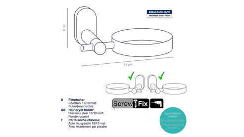 Unser moderner, schwarzer Fönhalter Alessio aus Edelstahl verleiht Ihrem Badezimmer einen Hauch von Eleganz und Ordnung. Dank seiner matten Pulverbeschichtung passt er perfekt zu modernen Einrichtungsstilen und bietet dem Fön einen sicheren Platz an der Wand. Das Montagematerial zur Befestigung mit Schrauben liegt dem Artikel bei. Maße ca. 14 x 6 x 11 cm (BxHxT)