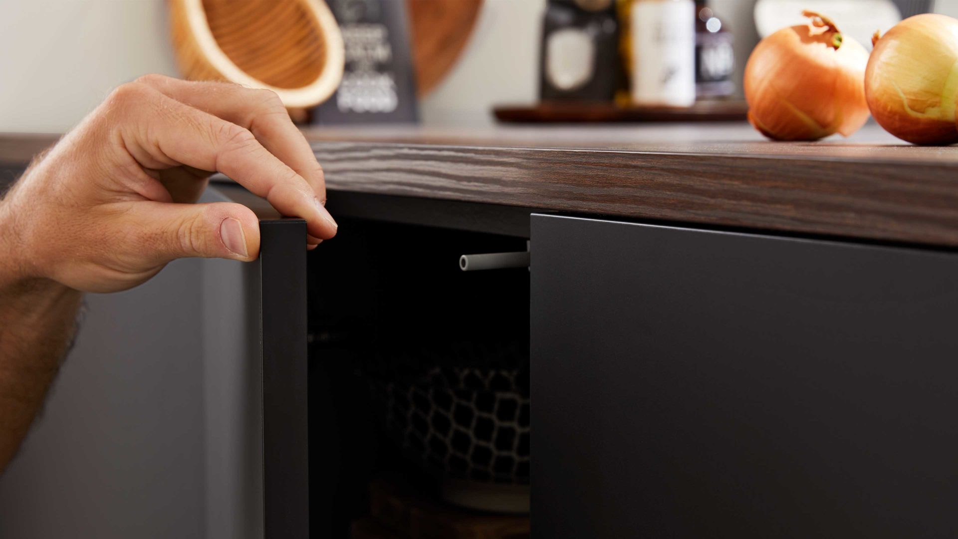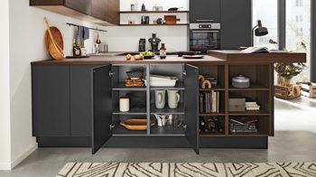 Die Interliving Küche Serie 3099 verbindet moderne Eleganz mit natürlicher Wärme. Softmatte schwarze Fronten treffen auf die freundliche Ausstrahlung der Kuba Nussbaum-Nachbildung. Korpus und Sockelblenden erscheinen in edlem Schwarz, während Arbeits- und Thekenplatten mit Dickkante sowie offene Regalelemente den warmen Holzton aufgreifen. So entsteht ein spannender Kontrast, der der Küche Tiefe und Persönlichkeit verleiht.