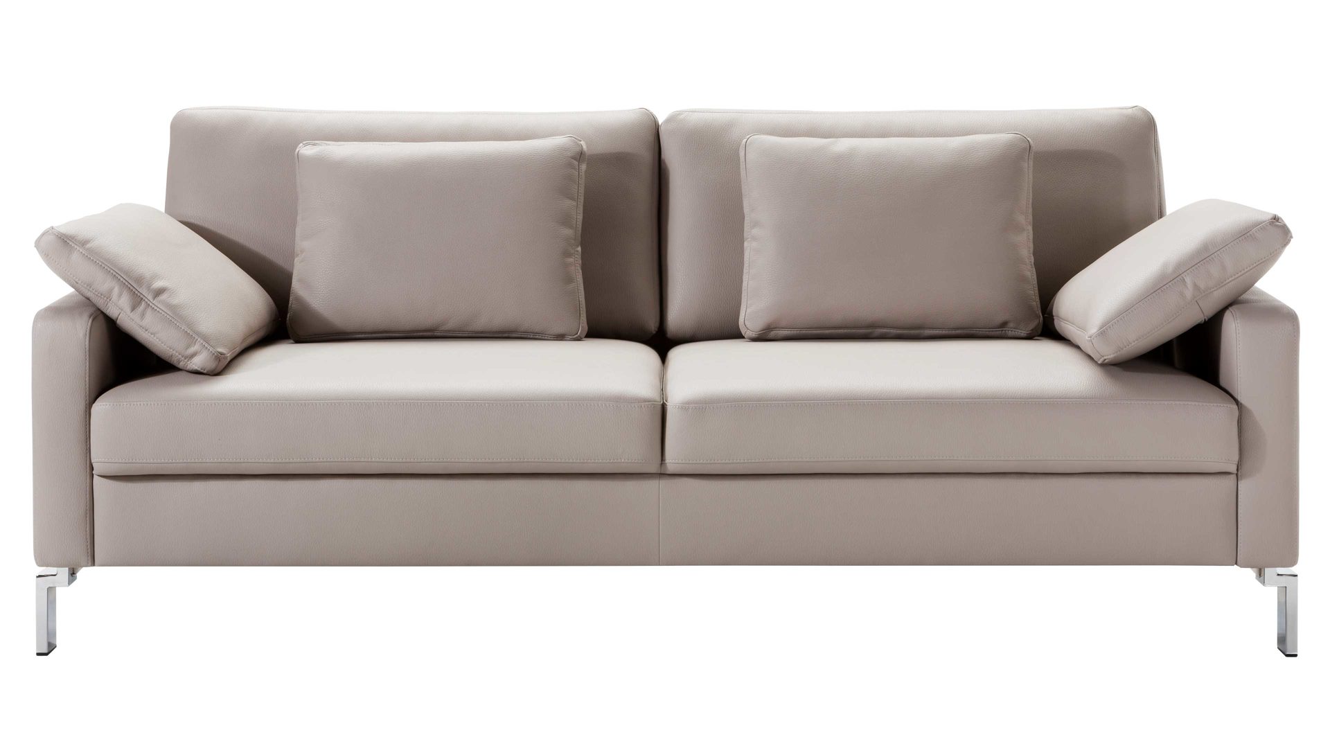 Optisch ansprechend sind der hellgrau pigmentierte Lederbezug und die Chromfüße, die das moderne und zugleich zeitlose Design des Dreisitzer-Sofas unterstreichen. Optimal sind die Sitzhöhe von ca. 45 cm sowie die zwei losen Rückenkissen des Polstermöbels. Das Leder zeichnet sich durch alltagstauglich- und pflegefreundlichkeit aus und überzeugt duch besonders weichen Griff.