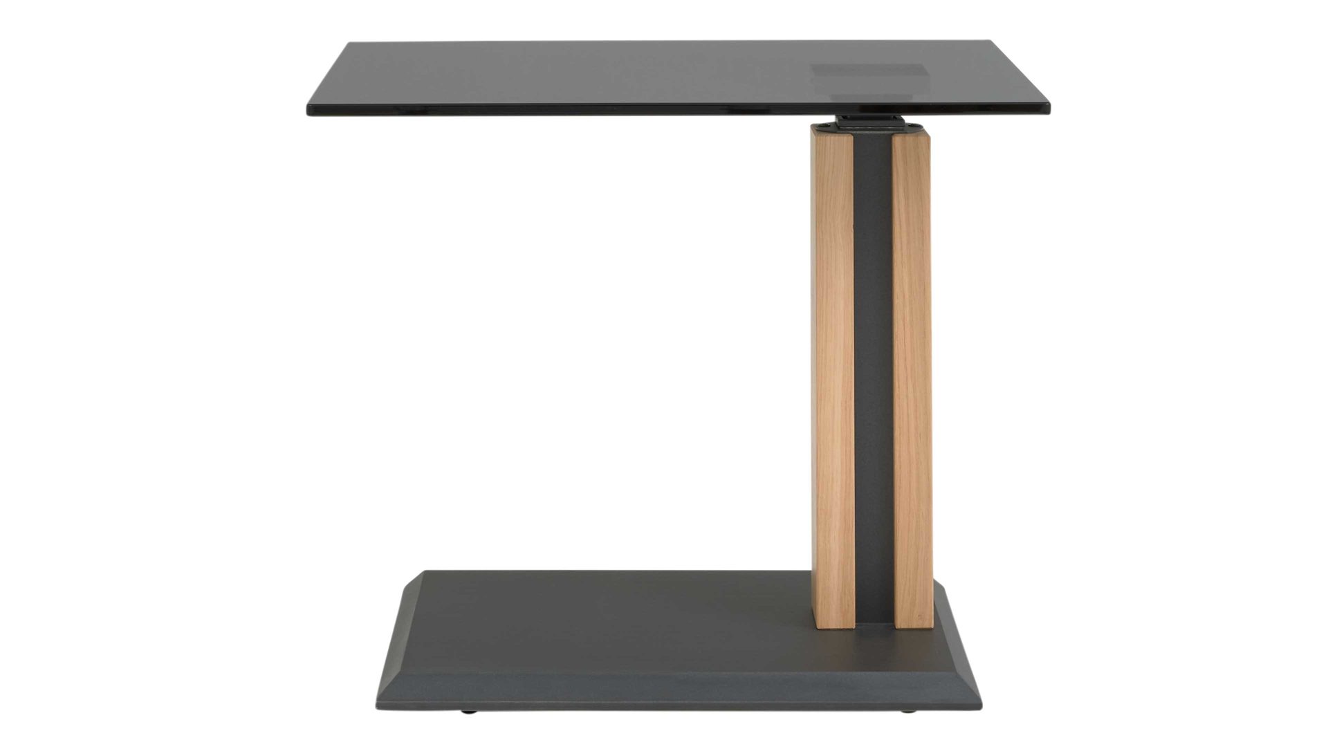 Mit Maßen von ca. 55 x 47–65 x 47 cm (BxHxT) ist der Tisch kompakt, vielseitig und harmoniert perfekt mit modernen Wohnumgebungen. Alternativ ist er auch mit einer perlsilberfarbenen Bodenplatte und einer Klarglas-Tischplatte erhältlich – für eine hellere, luftigere Raumwirkung.
