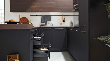 Die Interliving Küche Serie 3099 verbindet moderne Eleganz mit natürlicher Wärme. Softmatte schwarze Fronten treffen auf die freundliche Ausstrahlung der Kuba Nussbaum-Nachbildung. Korpus und Sockelblenden erscheinen in edlem Schwarz, während Arbeits- und Thekenplatten mit Dickkante sowie offene Regalelemente den warmen Holzton aufgreifen. So entsteht ein spannender Kontrast, der der Küche Tiefe und Persönlichkeit verleiht.