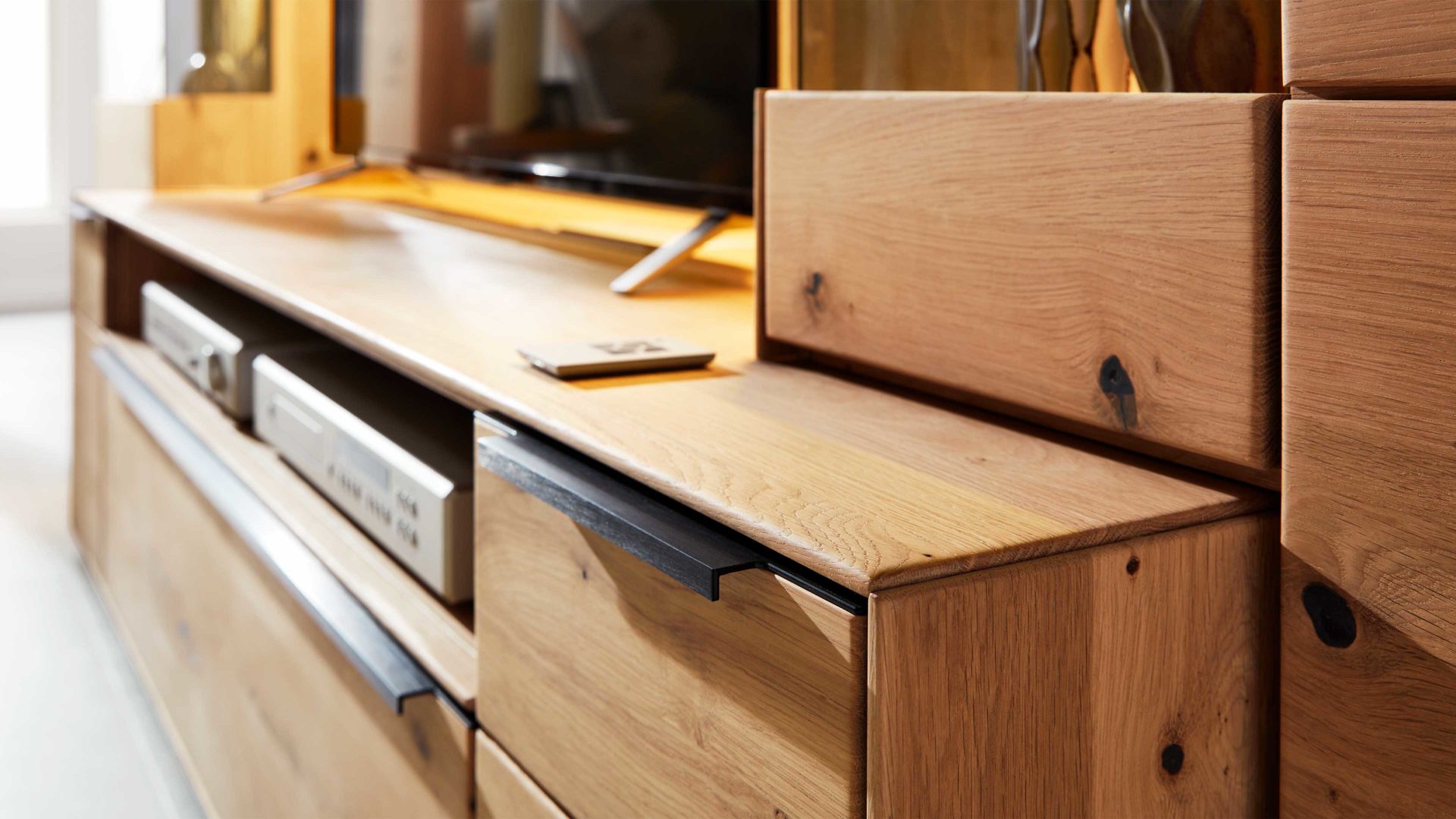 Lowboard aus der Interliving Wohnzimmer Serie 2020 – Massivholz mit durchdachter Medienausstattung