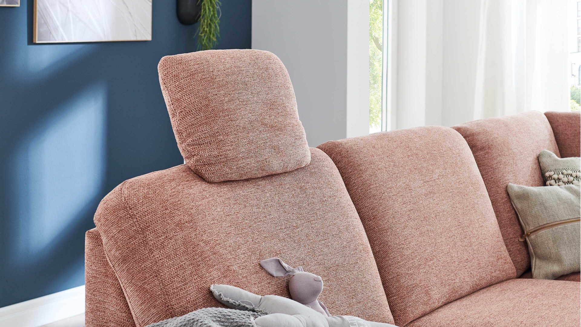 Es ist mit trendig sienafarbenem Webstoff bezogen, der edle Gemütlichkeit ausstrahlt und mit verschiedenen Einrichtungen bestens harmoniert. Runde schwarze Metallfüße vervollständigen das attraktive Design und verleihen dem Sofa überdies die nötige Standfestigkeit.