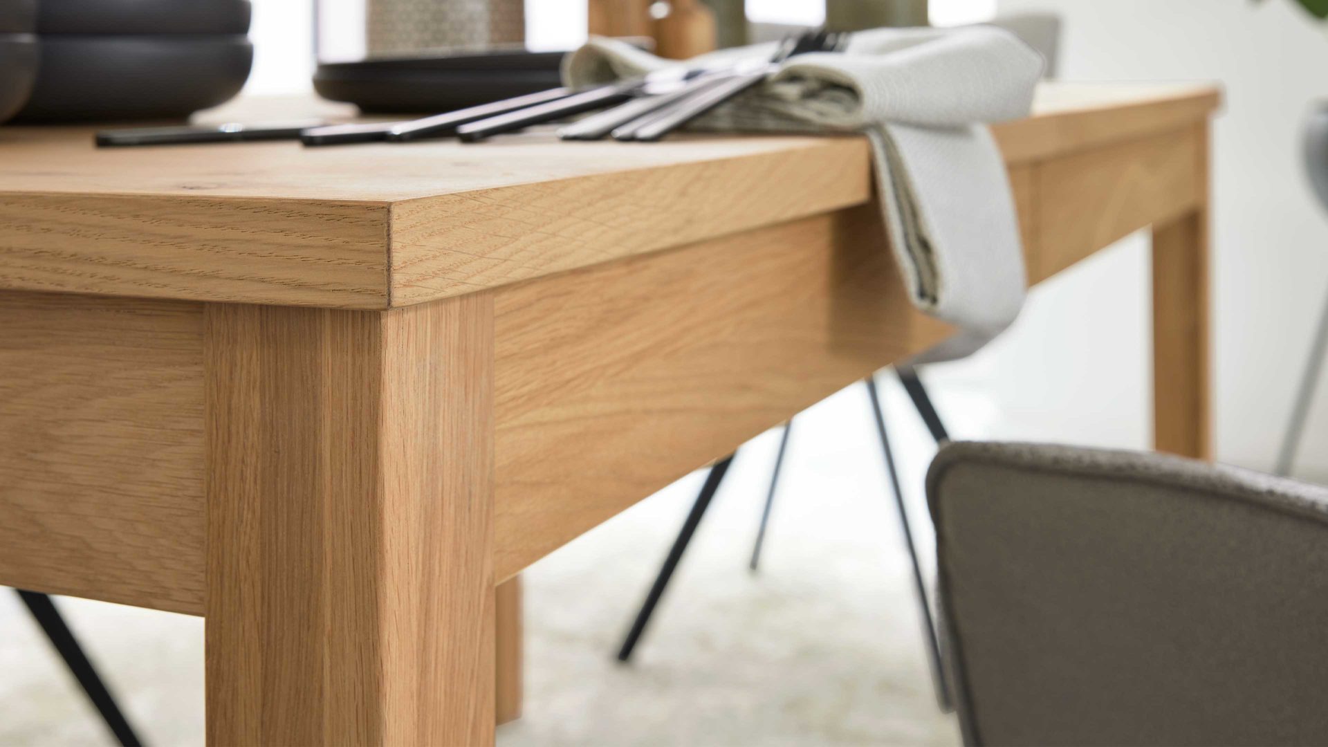 Mit Gesamtmaßen von ca. 160–220 x 77 x 90 cm (LxHxT) bietet der Esstisch viel Fläche, ohne wuchtig zu wirken. Die klaren Linien, das hochwertige Eichefurnier und die natürliche Maserung verleihen ihm eine warme, moderne Optik, die perfekt zu den weiteren Möbeln der Serie passt.