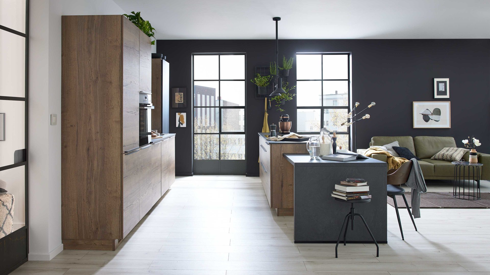 Die Culineo® Einbauküche C382 überzeugt durch eine edle Kombination aus natürlichen Holztönen und modernen Glasakzenten. Fronten in Eiche Havanna-Nachbildung, kombiniert mit mattschwarzem Glas in schwarzen Aluminiumrahmen und eleganten schwarzen Griffleisten, schaffen ein luxuriöses, zeitloses Design. Die Nischenverkleidung im Dekor Golden Art setzt stilvolle Akzente, während die Arbeitsplatten im Dekor Evora Ceramic Rocher Noir mit ihrer feinen Steinstruktur den hochwertigen Charakter der Küche unterstreichen. Abgerundet wird das harmonische Gesamtbild durch Sockelblenden in Eiche Havanna-Nachbildung und einen grauschieferfarbenen Ansetztisch, der zusätzlichen Platz zum Essen, Arbeiten oder gemeinsamen Kochen bietet.