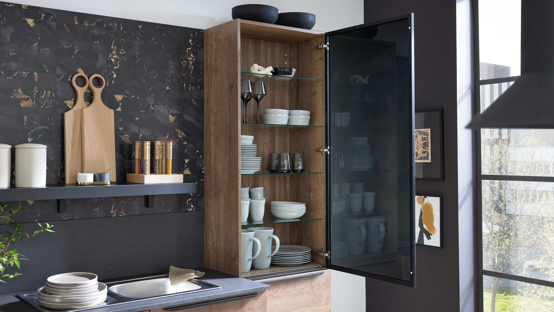 Culineo® Einbauküche C382 mit AEG Einbaugeräten – moderne Eleganz in Holz und Schwarzglas