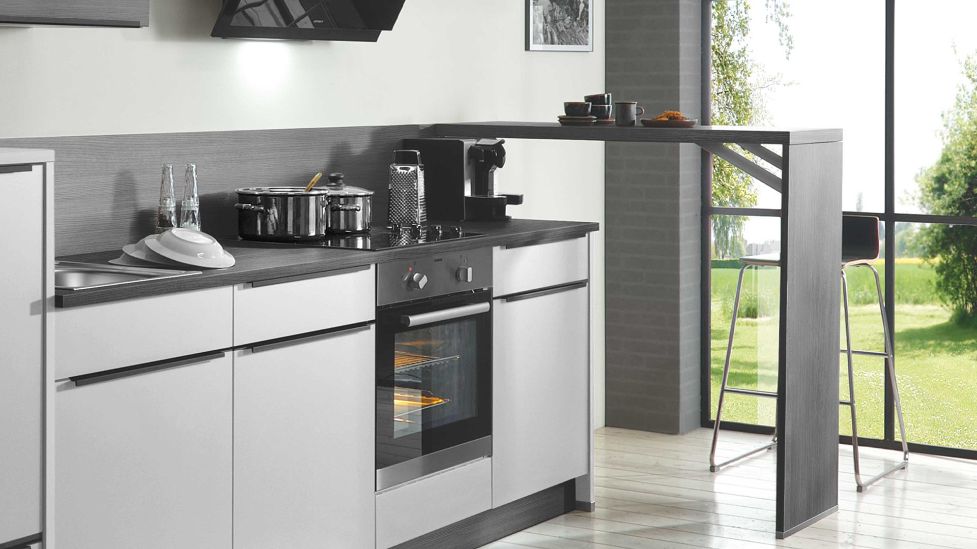 matte hellgraue Lacklaminatfronten, kombiniert mit grauer Eiche-Nachbildung