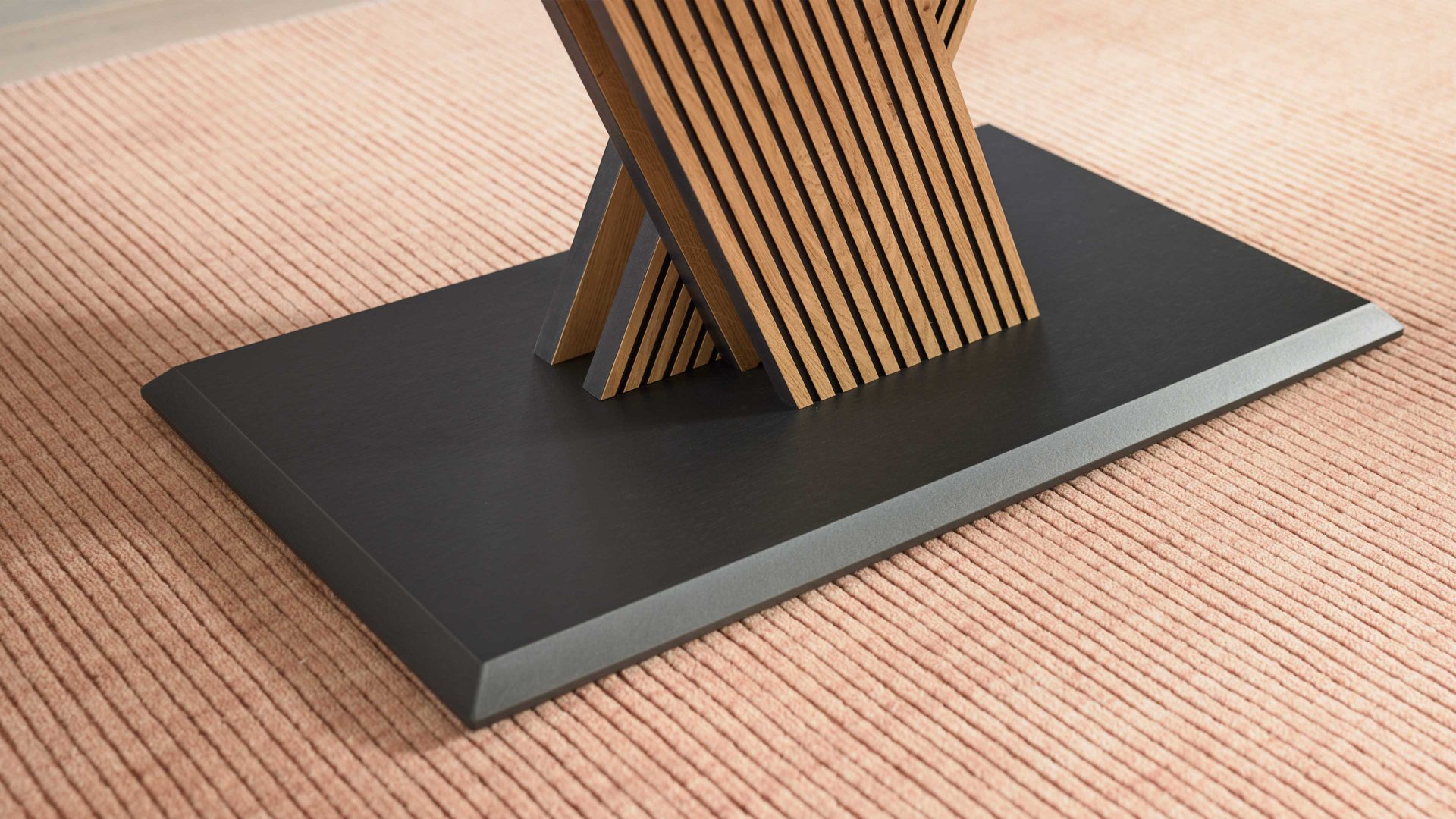 Ein weiteres praktisches Detail sind die verdeckten Rollen unter der Bodenplatte. Sie ermöglichen es, den Tisch mühelos im Raum zu verschieben, ohne den Boden zu beschädigen – perfekt für flexible Wohnkonzepte. Mit Maßen von ca. 110 x 48–64 x 65 cm (L/BxHxT) bietet der Tisch eine ideale Größe für moderne Wohnräume und kombiniert Stabilität mit Leichtigkeit im Design.