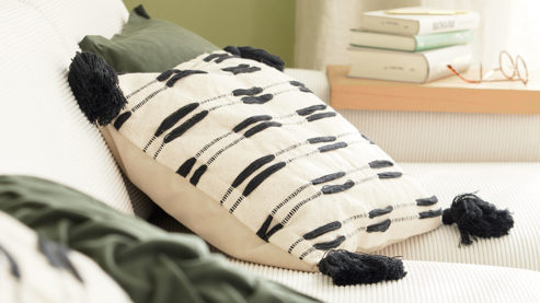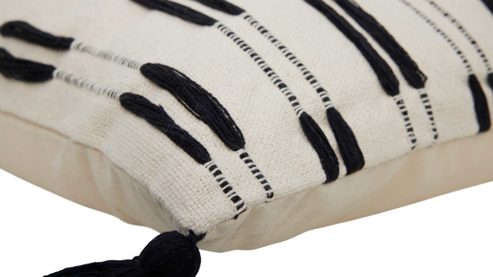 Kissenbezug mit aufwändig eingenähten Wollfäden, unifarbener Rückseite und Quasten an jeder Ecke